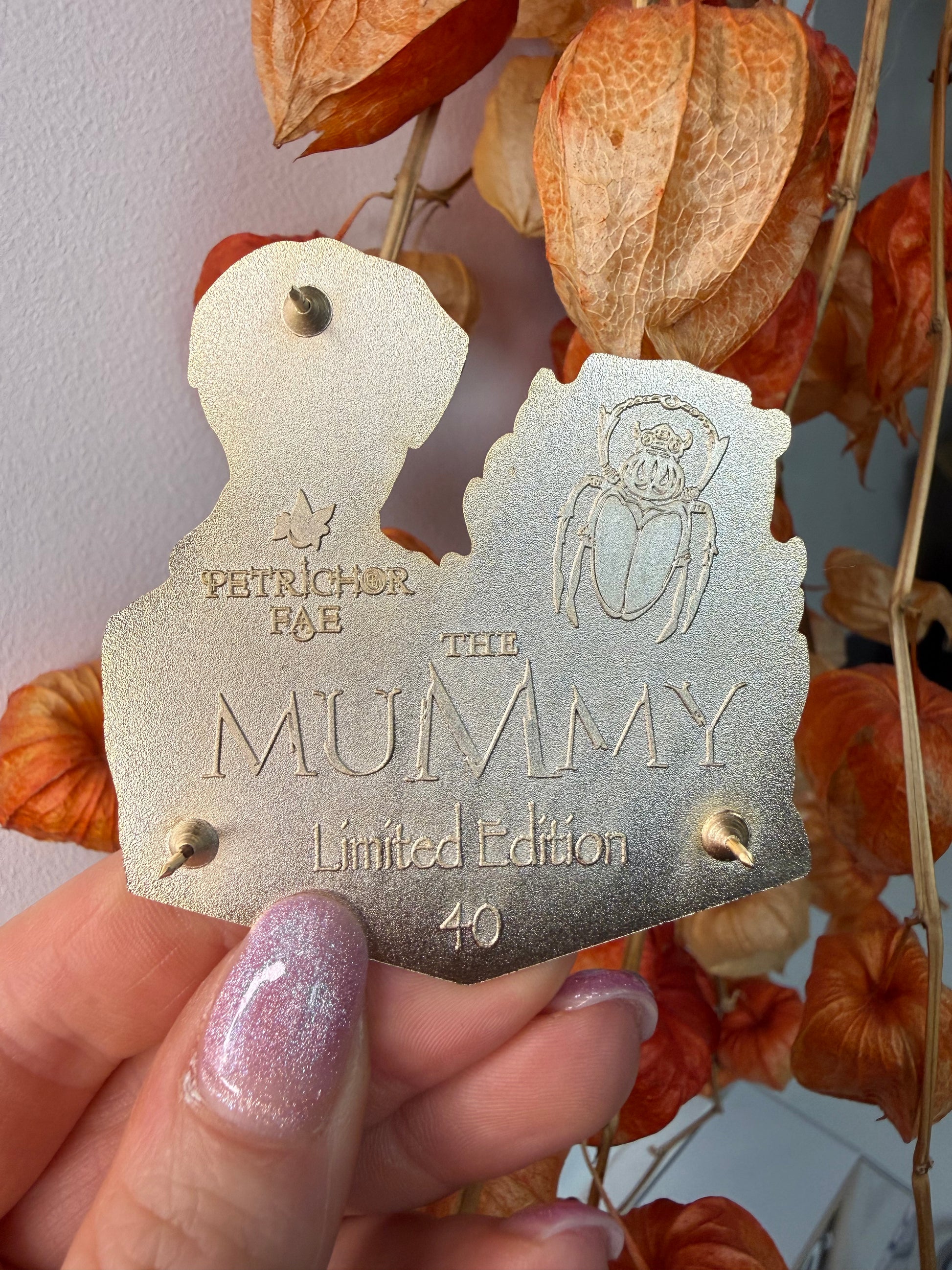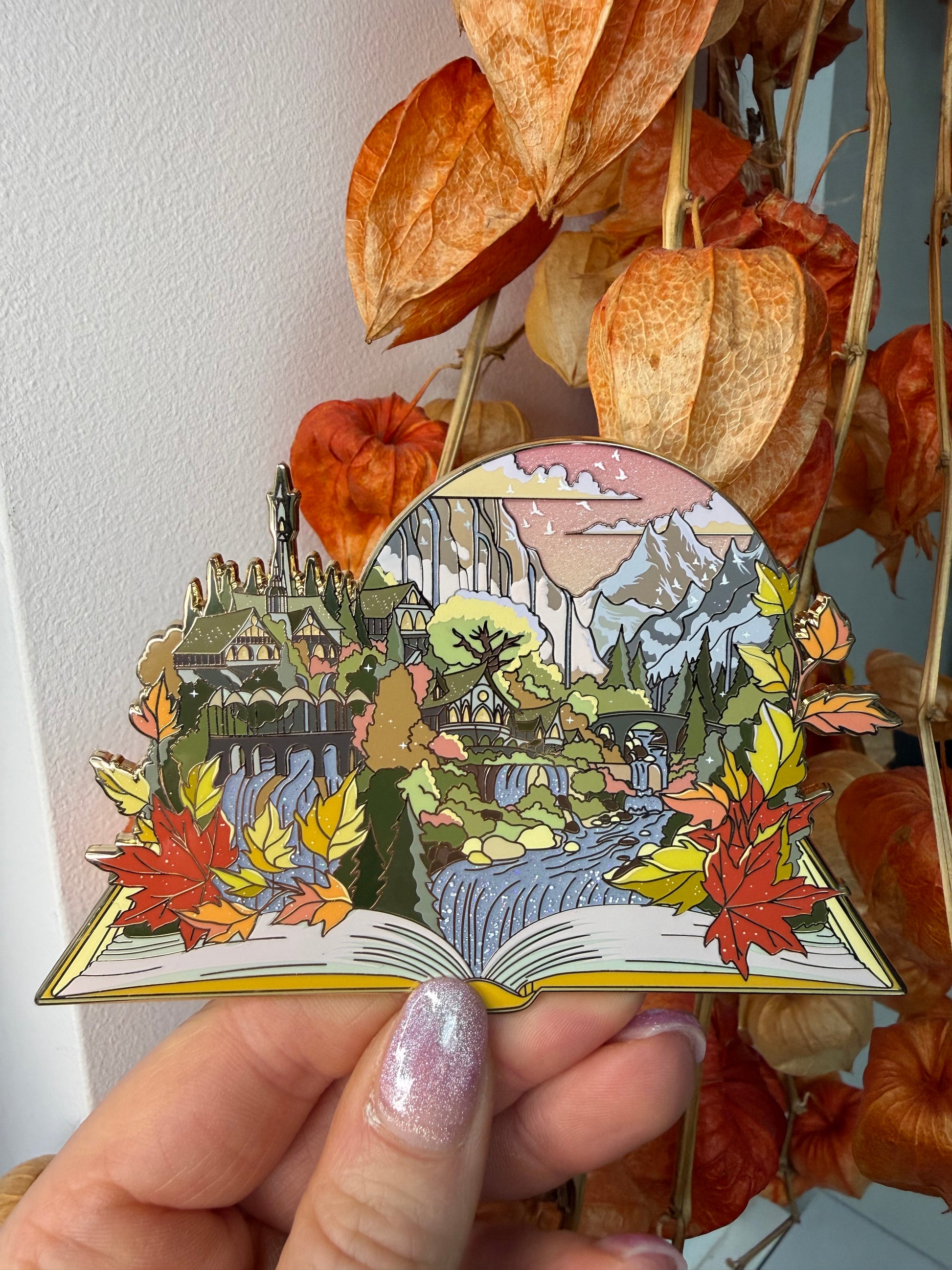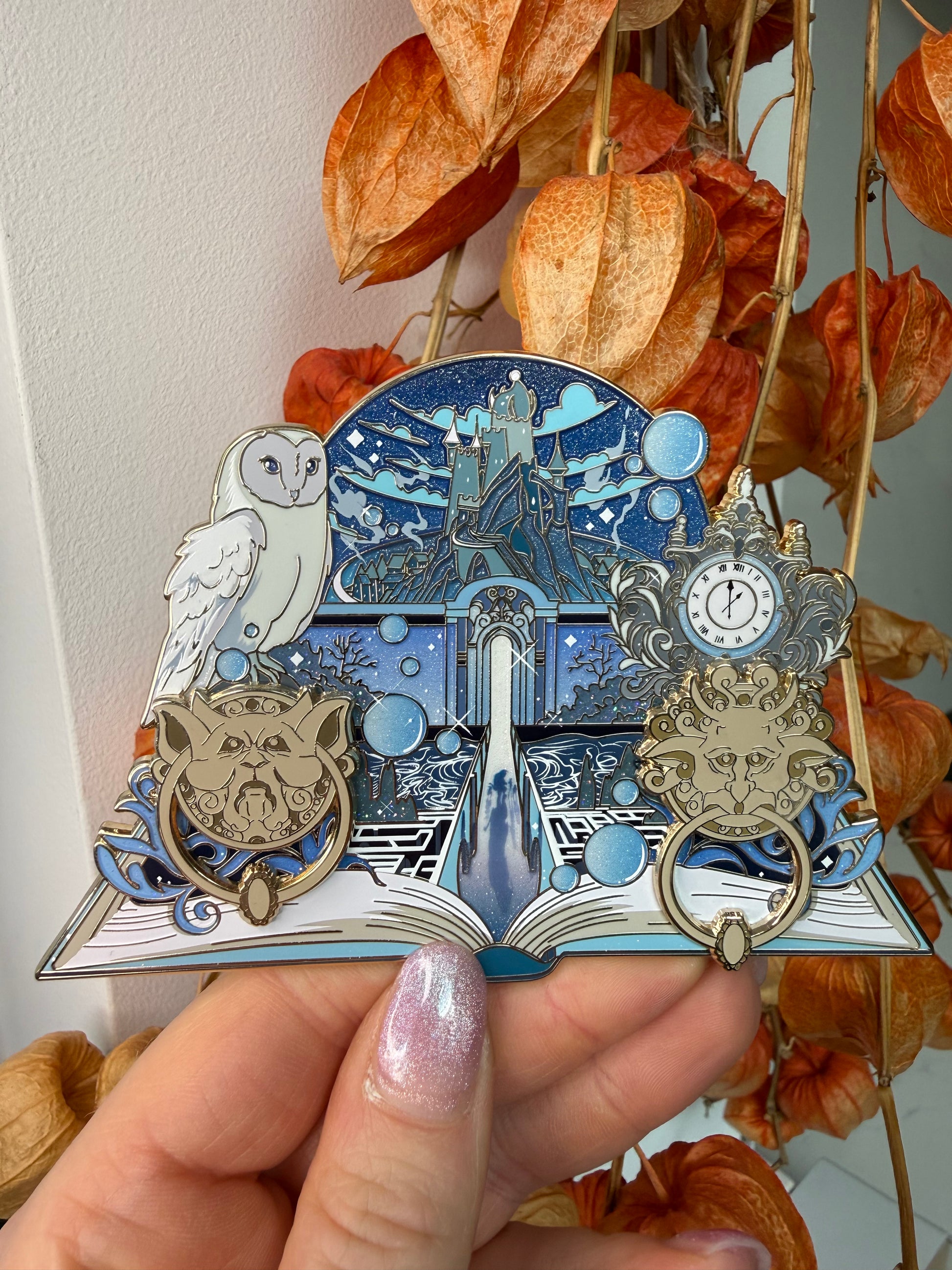 - Iabyrinth Book: 4.5 inch Pin-on-Pin, gold plated, pearl shimmer gradient, glitter. LE 50